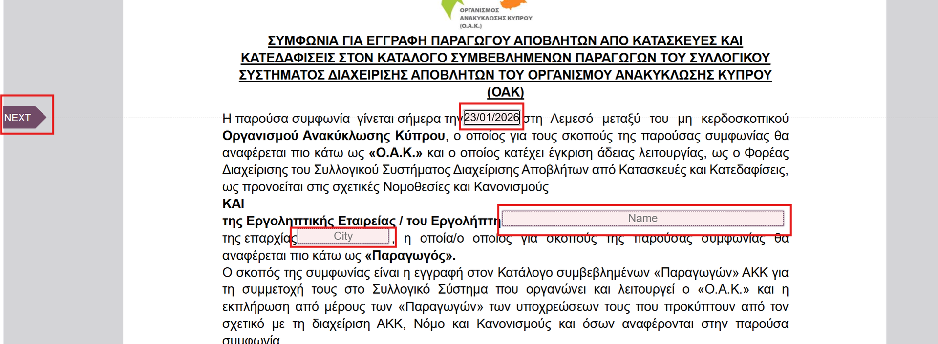 Σημειώνεται ότι ορισμένα πεδία συμπληρώνονται αυτόματα (όπως η ημερομηνία, η ονομασία του Εργολήπτη και η τάξη Εργολήπτη). Στις περιπτώσεις αυτές δεν απαιτείται καμία ενέργεια από εσάς· απλώς επιλέγετε Next για να συνεχίσετε.