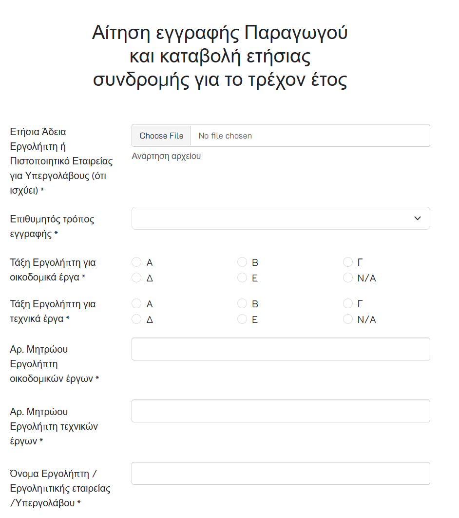 Ο Εργολήπτης καταχωρεί τα απαιτούμενα στοιχεία που εμφανίζονται στην ενότητα «Αίτηση για εγγραφή Παραγωγού».