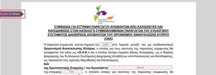 Για να ξεκινήσετε τη διαδικασία υπογραφής της Συμφωνίας, επιλέγετε Click to Start, συμπληρώνετε το αντίστοιχο πεδίο (εφόσον δεν συμπληρώνεται αυτόματα) και στη συνέχεια επιλέγετε Next για να μεταβείτε στο επόμενο πεδίο.